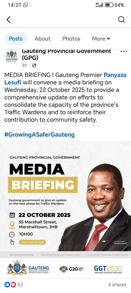 Gauteng Premier Panyaza Lesufi will convene a media briefing on Wednesday, 22 October 2025, to deliver a comprehensive update on plans to strengthen the capacity and operations of the province’s Traffic Wardens.