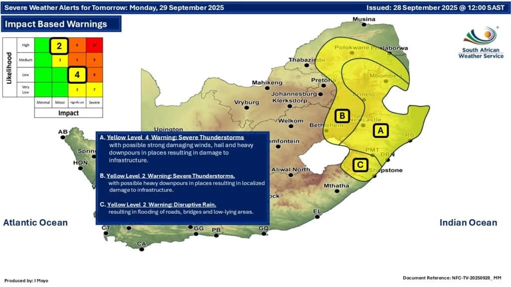 The South African Weather Service (SAWS) has escalated warnings to Level 4 for severe storms expected to hit parts of Gauteng, the Free State, Limpopo, Mpumalanga, and KwaZulu-Natal. The public is urged to prepare for potentially destructive conditions, including significant hail, flooding of formal and informal settlements, and fast-flowing streams that pose a “real danger to life.”